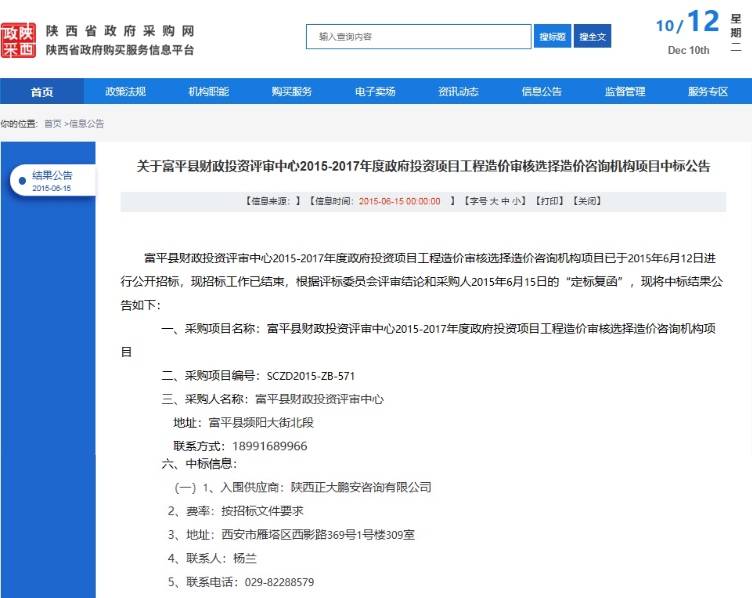 2015年6月15日,經(jīng)評標(biāo)委員會綜合評審,招標(biāo)人確認(rèn),正大鵬安建設(shè)項(xiàng)目管理有限公司中標(biāo)關(guān)于富平縣財(cái)政投資評審中心2015-2017年度政府投資項(xiàng)目工程造價審核選擇造價咨詢機(jī)構(gòu)項(xiàng)目。