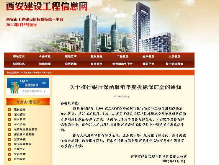 按照省住建廳《關于在工程建設領域推行銀行保函和工程信用擔保的通知》要求,從2016年元月1日起,在西安市建設工程招投標領域全面推行銀行保函與單項投標保證金并行方式,同時停止使用年度投標保證金。已辦理年度投標保證金的企業(yè),請于2015年12月31日前到西安建設工程交易中心財務室辦理退還手續(xù)。