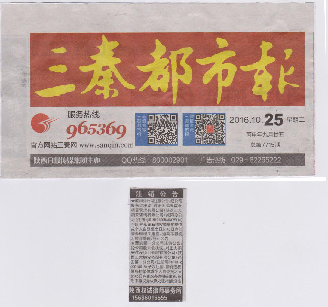 經(jīng)公司股東會決議,對正大鵬安建設(shè)項目管理有限公司(陜西正大鵬安咨詢有限公司)西安第一分公司(注冊號610131200018618)予以注銷,請有債權(quán)債務的單位或個人自登報之日起45日內(nèi)前來辦理相關(guān)事宜,逾期不報視為放棄處理,特此公告。