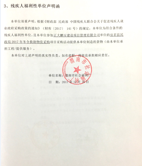 本項目第二標段成交供應商渭南市社會福利廠為殘疾人福利性企業(yè)后附《殘疾人福利性單位聲明函》