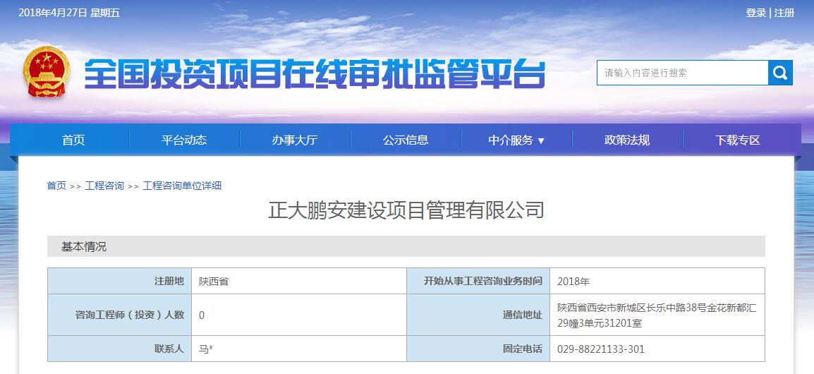 2018年4月26日,中國工程咨詢協(xié)會網(wǎng)站公告:正大鵬安建設(shè)項目管理有限公司“工程咨詢單位資格”備案核準(zhǔn)通過。