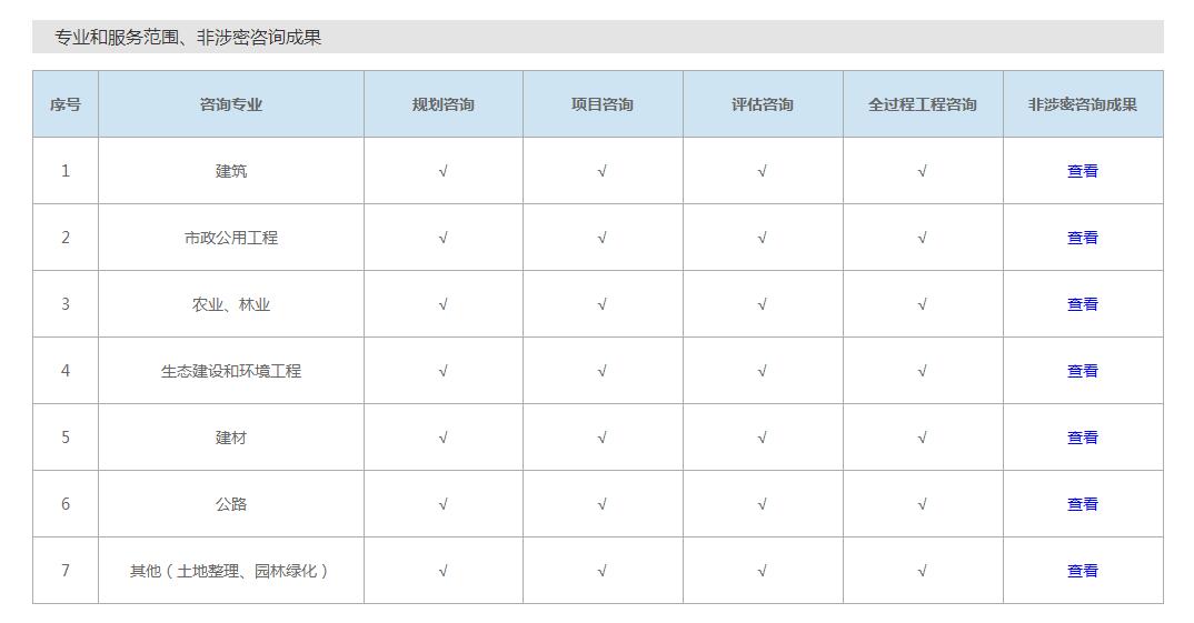 咨詢專業(yè)包括:建筑、市政公用工程、農(nóng)業(yè)林業(yè)、生態(tài)建設(shè)和環(huán)境工程、建材、公路、其他(土地整理、園林綠化),服務(wù)范圍包括:規(guī)劃咨詢、項目咨詢、評估咨詢、全過程咨詢等。