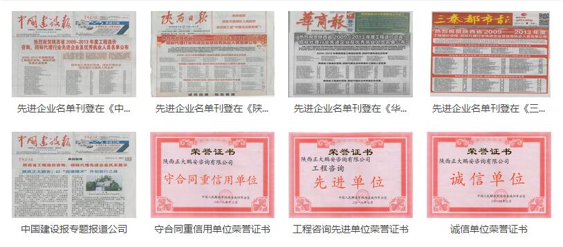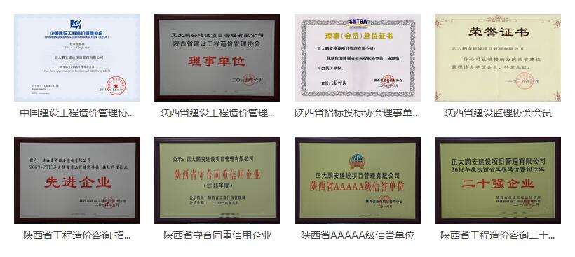 正大鵬安公司在行業(yè)地位不斷提升的同時,市場占有率和社會認可度也不斷提高。近年來,正大鵬安公司先后榮獲陜西省工程造價咨詢招標代理行業(yè)先進企業(yè)、陜西省守合同重信用企業(yè)、陜西省AAAAA級信譽單位、陜西省工程造價咨詢行業(yè)二十強企業(yè)、全國工程造價咨詢AAA級(最高級)信用企業(yè)等社會榮譽,并榮獲ISO9001:2015質(zhì)量管理體系認證、ISO14001:2015環(huán)境管理體系認證和OHSAS18001:2007職業(yè)健康安全管理體系認證。