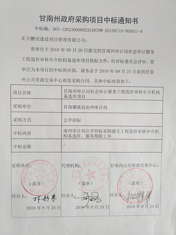 2018年8月,經(jīng)評標委員會綜合評審,招標人確認,正大鵬安建設(shè)項目管理有限公司中標甘南州審計局社會審計服務工程造價審核中介機構(gòu)備選庫項目。