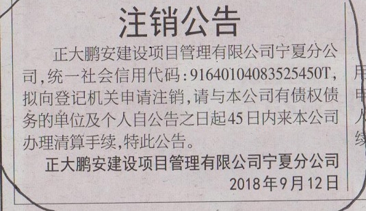 經(jīng)公司股東會(huì)決議,對(duì)正大鵬安建設(shè)項(xiàng)目管理有限公司寧夏分公司(注冊(cè)號(hào)91640104083525450T)予以注銷(xiāo),請(qǐng)有債權(quán)債務(wù)的單位和個(gè)人自登報(bào)之日起45日內(nèi)前來(lái)辦理相關(guān)事宜,逾期不報(bào)視為放棄處理,特此公告。