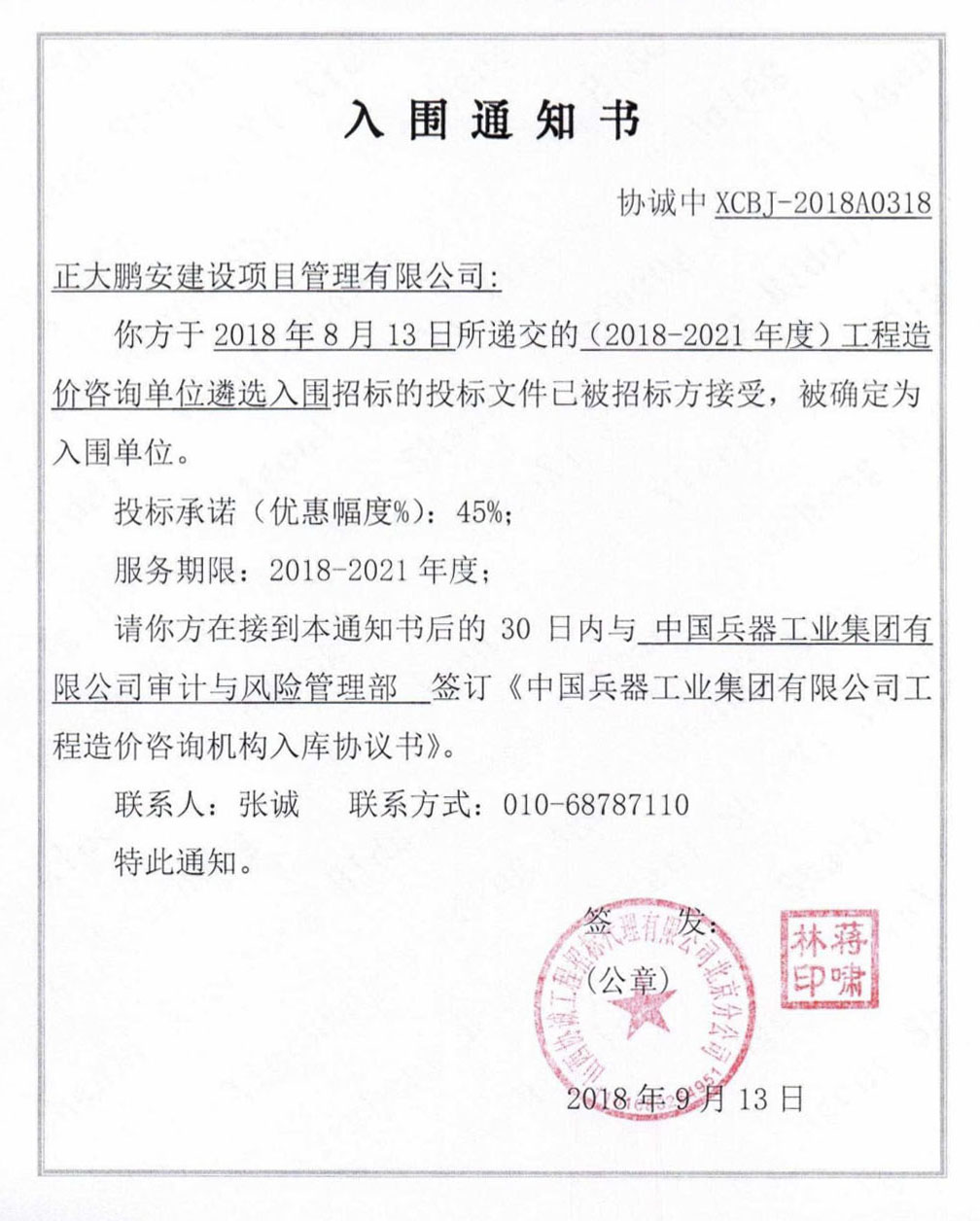 正大鵬安公司成功入圍中國兵器工業(yè)集團(tuán)(2018—2021年度)工程造價咨詢單位遴選項(xiàng)目
