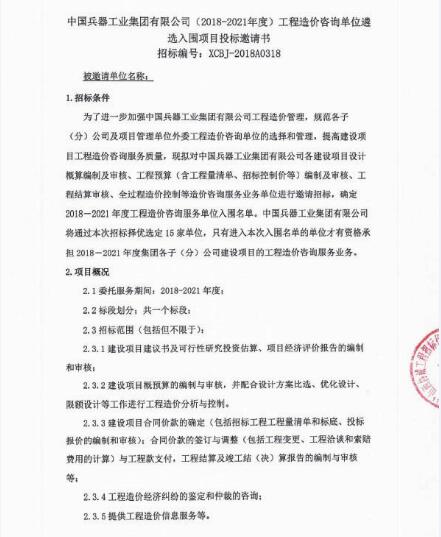 2018年8月13日,中國兵器工業(yè)集團(tuán)就(2018—2021年度)工程造價咨詢單位遴選入圍項(xiàng)目進(jìn)行了公開招標(biāo)。