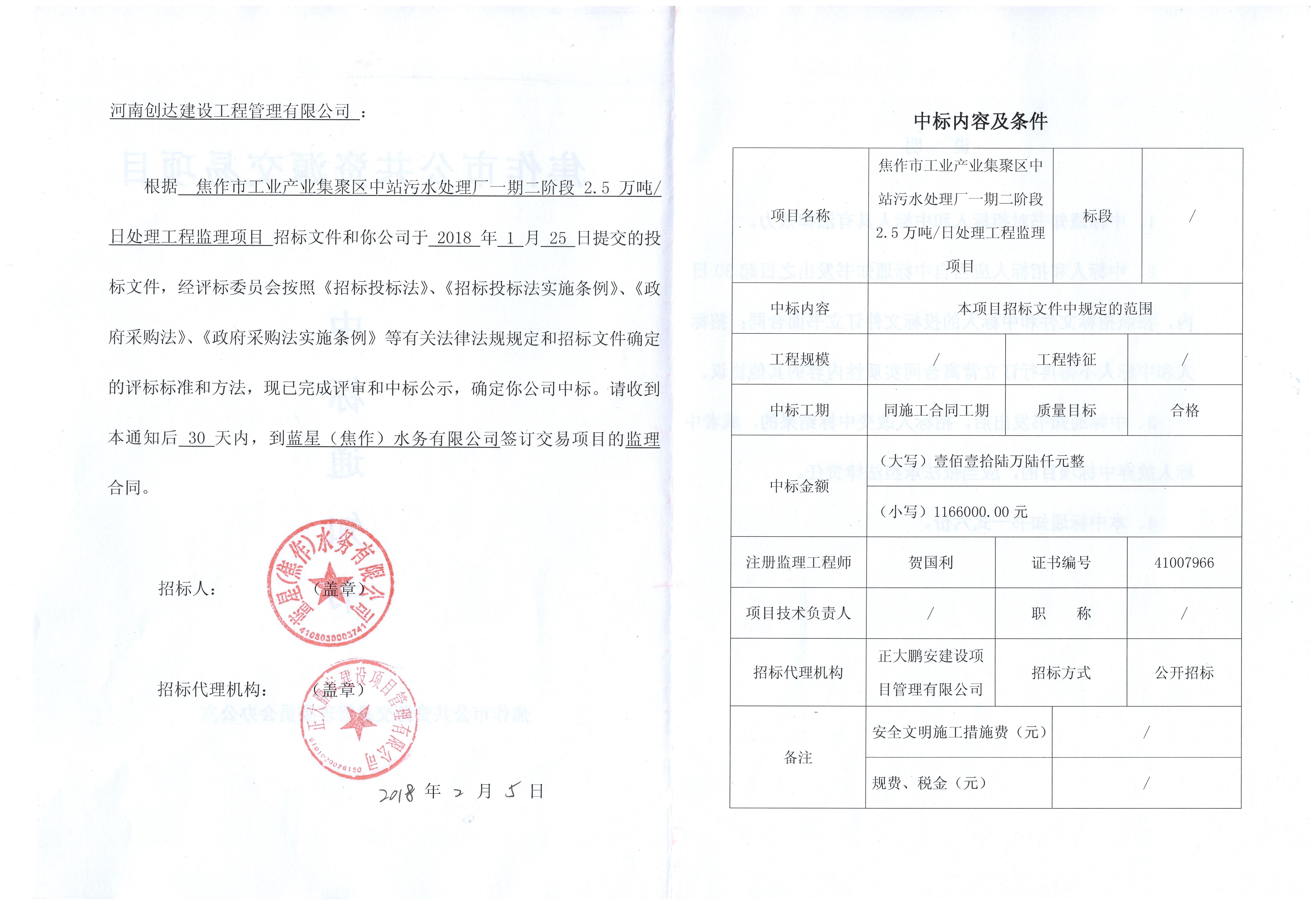 項(xiàng)目名稱:焦作市工業(yè)集聚區(qū)中站污水處理廠一期二階段2.5萬噸/日處理工程
