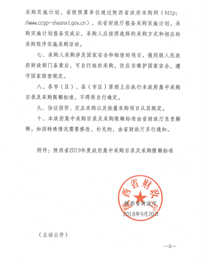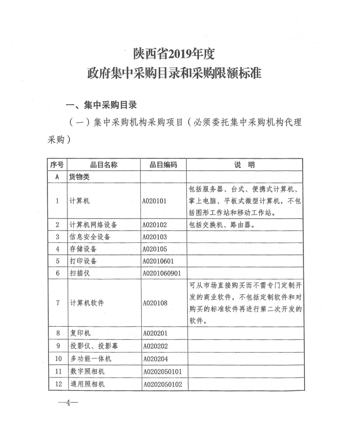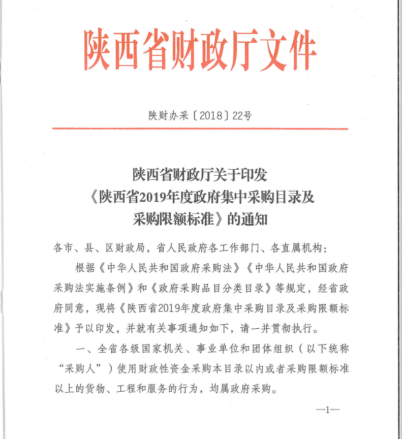 陜西省財政廳關(guān)于印發(fā)《陜西省2019年度政府集中采購目錄及采購限額標(biāo)準(zhǔn)》的通知