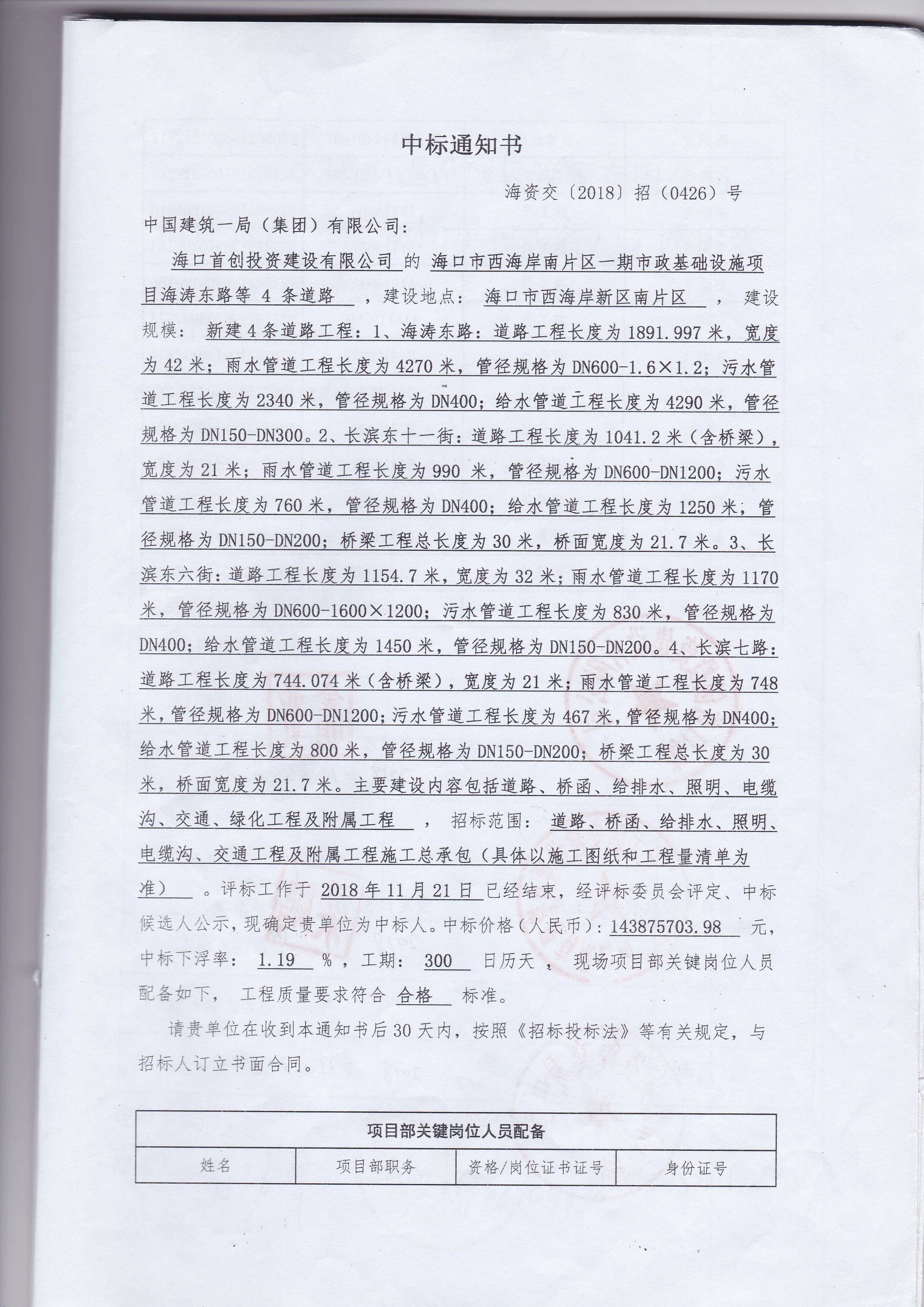 項目名稱:??谑形骱0赌掀瑓^(qū)一期市政基礎設施項目海濤東路等 4條道路施工