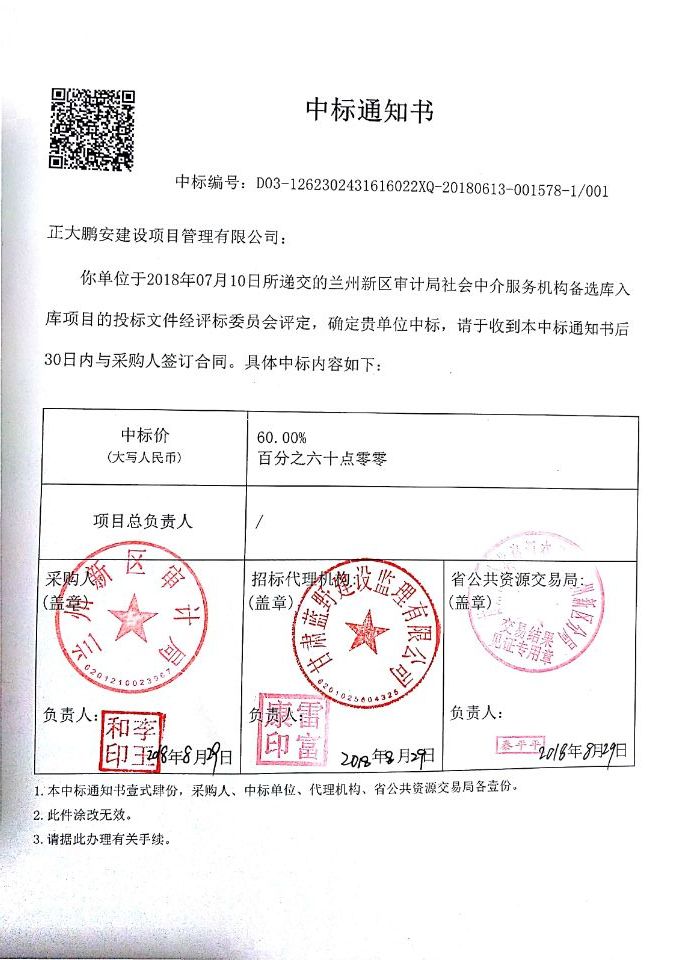 正大鵬安中標蘭州新區(qū)審計局社會中介服務機構備選庫入庫項目