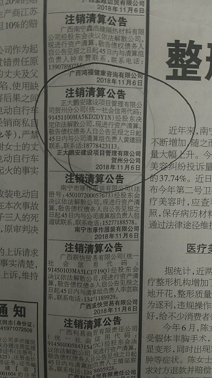經(jīng)公司股東會決議,現(xiàn)對正大鵬安建設項目管理有限公司賀州分公司(注冊號91451100MA5KD2DY1N)予以注銷,請有債權債務的單位和個人自登報之日起45日內前來辦理辦理債權債務相關事宜,逾期不報視為放棄處理,特此公告。