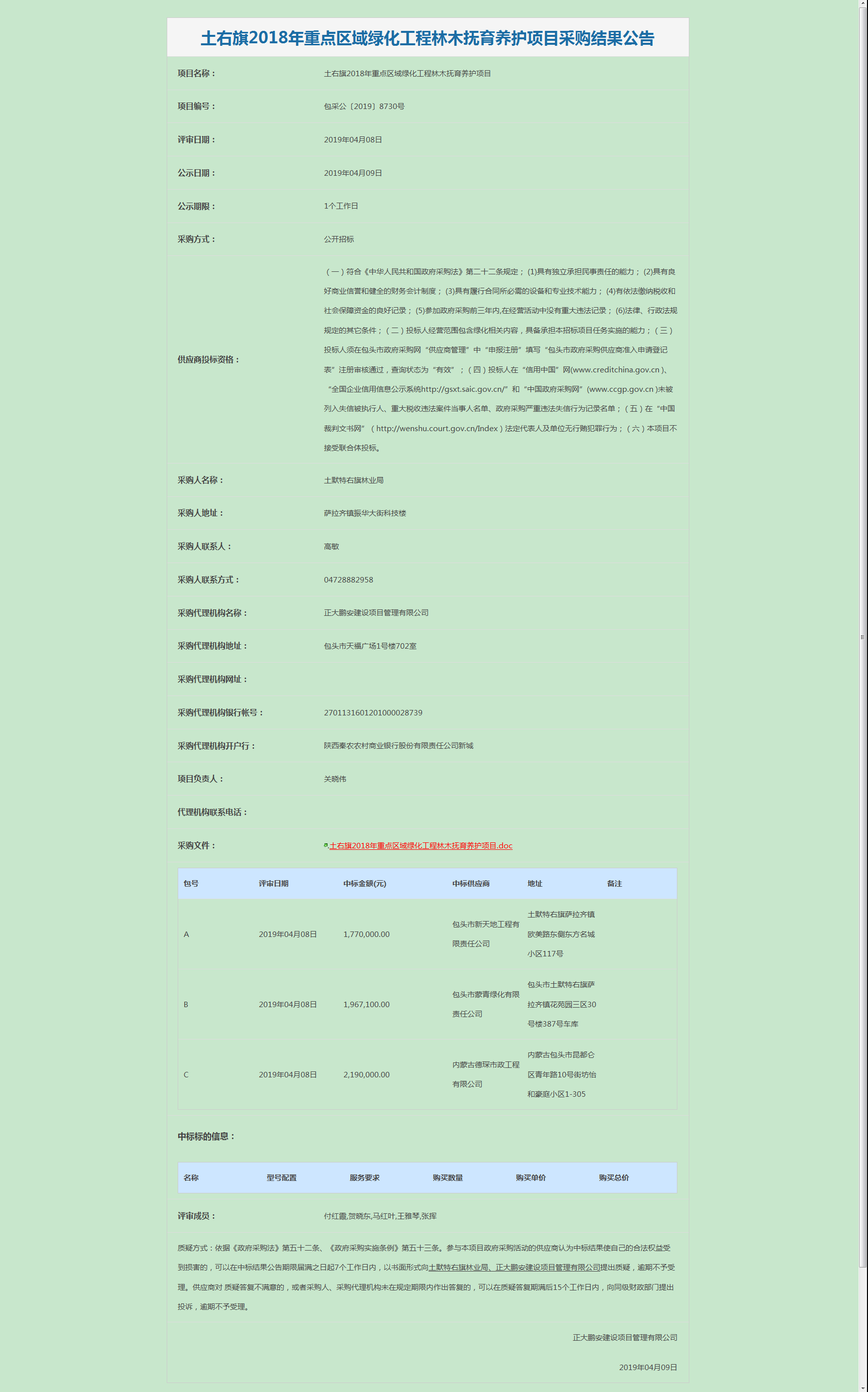 土右旗2018年重點(diǎn)區(qū)域綠化工程林木撫育養(yǎng)護(hù)項(xiàng)目采購(gòu)結(jié)果公告