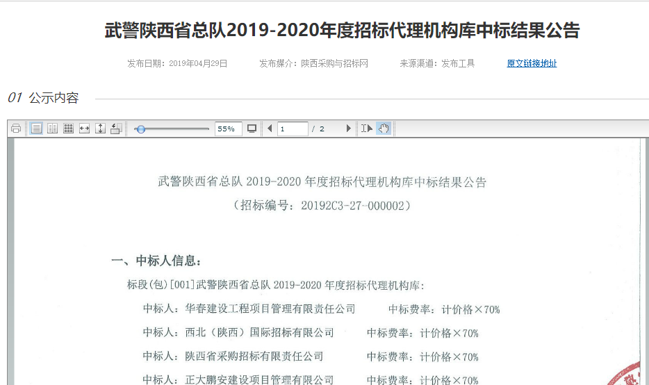 近日,武警陜西總隊對“武警陜西省總隊2019-2020年度招標代理機構(gòu)庫項目”進行公開招標,經(jīng)評標委員會綜合評審,招標人確認,正大鵬安建設(shè)項目管理有限公司已入圍。