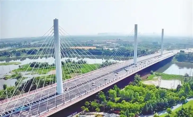 項目概況:紅光路灃河大橋位于灃河中下游河段,于西安市長安區(qū)高橋鄉(xiāng)嚴(yán)大村東南角、西寶高速新線灃河橋下游約850加處跨越灃河,起點(diǎn)樁號K0+880,終點(diǎn)樁號K2+100,橋梁全長917m,其中主橋長610m,引橋長307m,東岸引道工程長度286.5m,西岸引道工程長度16.5m,橋面設(shè)計總寬為55米,按分離式結(jié)構(gòu)設(shè)計。中央綠化帶寬1米,其中單幅橋面上BRT公交專用車道寬4.5米,四車道機(jī)動行車道各寬3.5米,非機(jī)動車道寬3米,人行道寬3米,結(jié)算審核投資額6.4億。