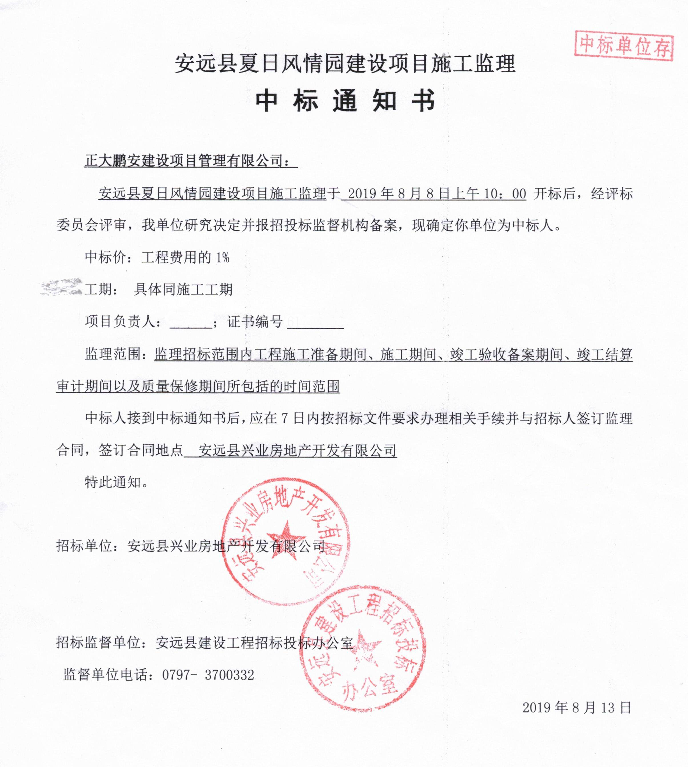 正大鵬安中標安遠縣夏日風情園建設(shè)項目施工監(jiān)理
