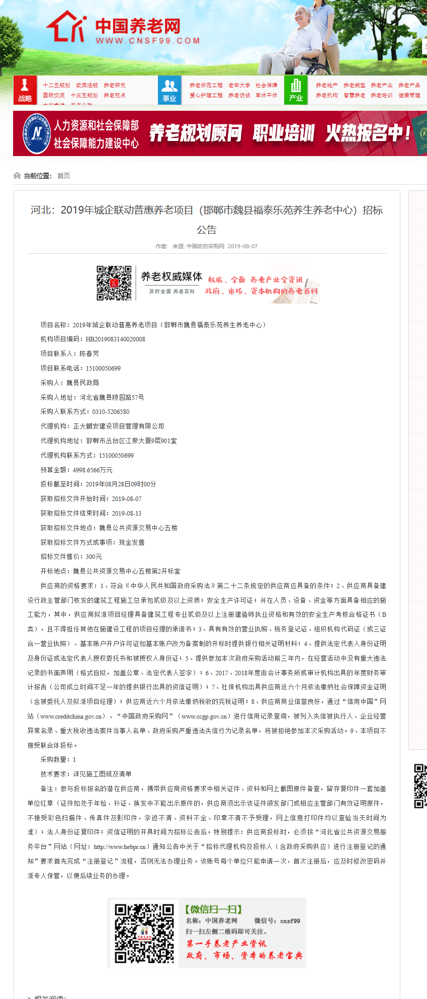 2019年城企聯(lián)動(dòng)普惠養(yǎng)老項(xiàng)目(邯鄲市魏縣福泰樂苑養(yǎng)生養(yǎng)老中心)項(xiàng)目
