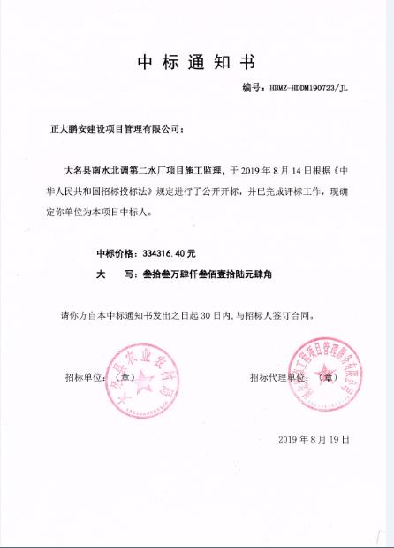 正大鵬安中標大名縣南水北調(diào)第二水廠項目施工監(jiān)理