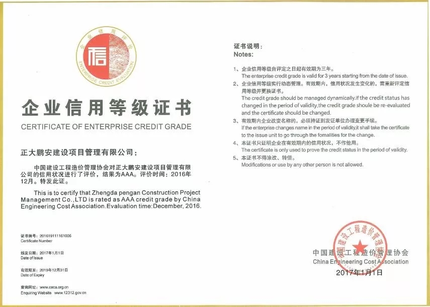 正大鵬安公司是獲得工程造價(jià)咨詢企業(yè)信用評(píng)價(jià)AAA級(jí)的首批企業(yè),此次獲得AAA級(jí)是連續(xù)第二次獲此殊榮。