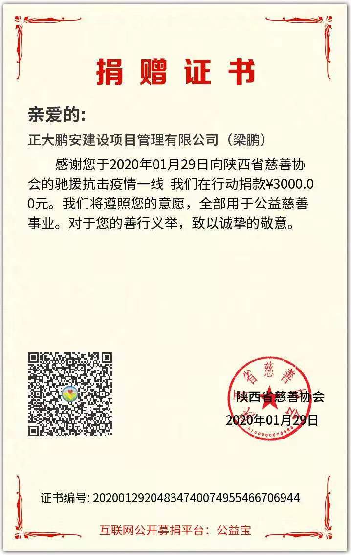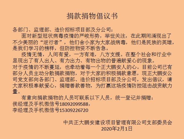 新冠無(wú)情,人間有愛(ài)。2月1日,在新冠肺炎肆瘧橫行之際,正大鵬安建設(shè)項(xiàng)目管理有限公司黨支部組織愛(ài)心捐贈(zèng)活動(dòng),向包括分支在內(nèi)的公司廣大黨員和全體員工發(fā)出了《捐款捐物倡議書(shū)》。
