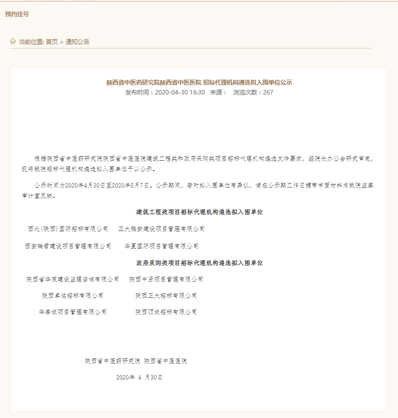 近日,陜西省中醫(yī)藥研究院、陜西省中醫(yī)醫(yī)院發(fā)布了招標(biāo)代理機(jī)構(gòu)遴選入圍單位公示,正大鵬安公司成功中標(biāo)。