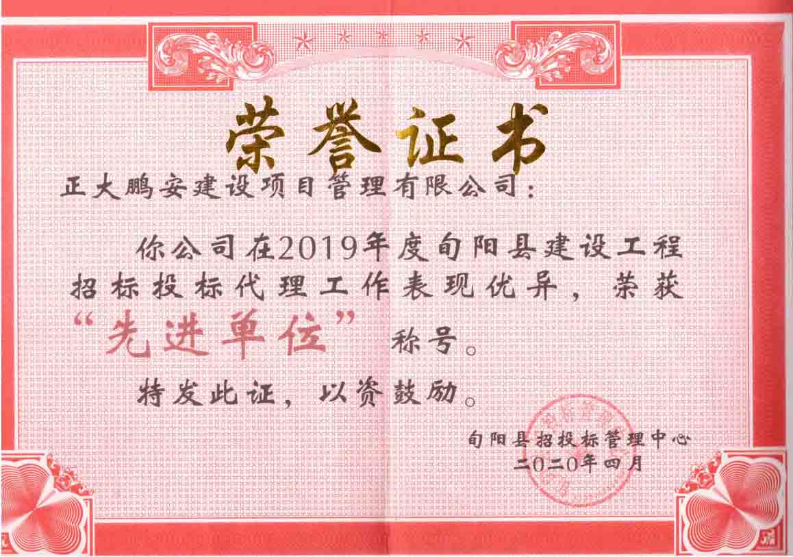 正大鵬安公司榮獲2019年度旬陽(yáng)縣建設(shè)工程招標(biāo)投標(biāo)代理工作先進(jìn)單位