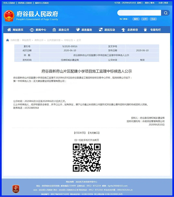 6月9日榆林市府谷縣住房和城鄉(xiāng)建設(shè)局委托第三方,就“府谷縣新府山片區(qū)配建小學(xué)項(xiàng)目監(jiān)理”進(jìn)行了公開招標(biāo),經(jīng)評(píng)標(biāo)委員會(huì)綜合評(píng)審,采購人確認(rèn),正大鵬安公司中標(biāo)該項(xiàng)目。