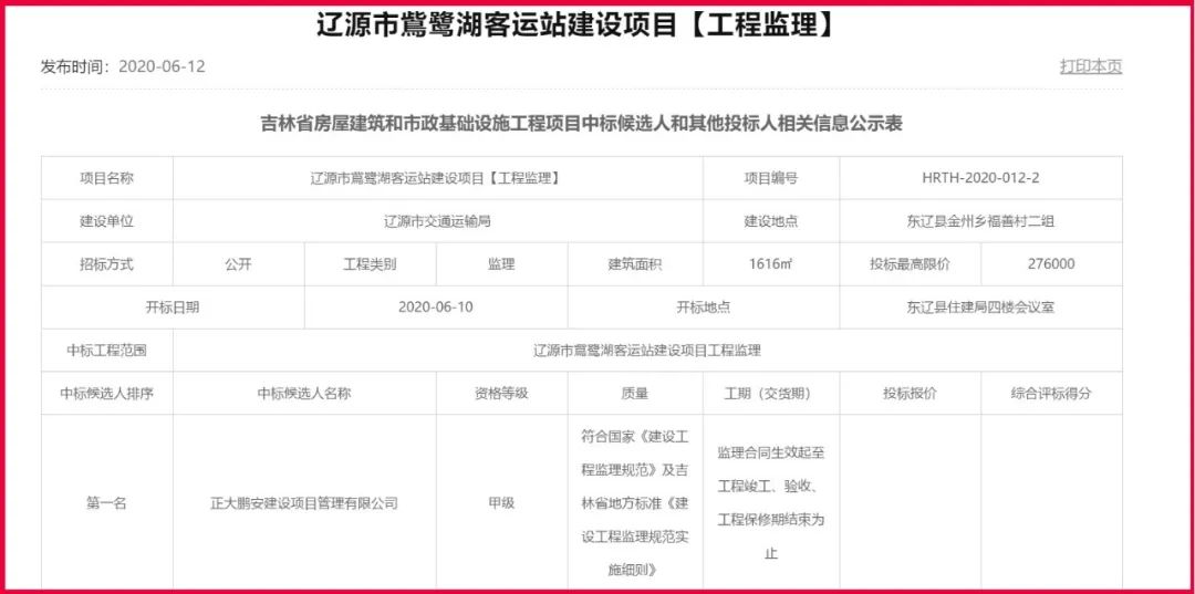 6月10日吉林省遼源市交通運(yùn)輸局委托第三方,就“遼源市鴜鷺湖客運(yùn)站建設(shè)項(xiàng)目工程監(jiān)理”(項(xiàng)目編號:HRTH-2020-012-2)進(jìn)行了公開招標(biāo),正大鵬安公司中標(biāo)該項(xiàng)目。