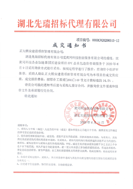 6月11日,正大鵬安公司中標黃岡科技企業(yè)加速器園區(qū)建設(shè)項目EPC總承包造價咨詢服務(wù)。