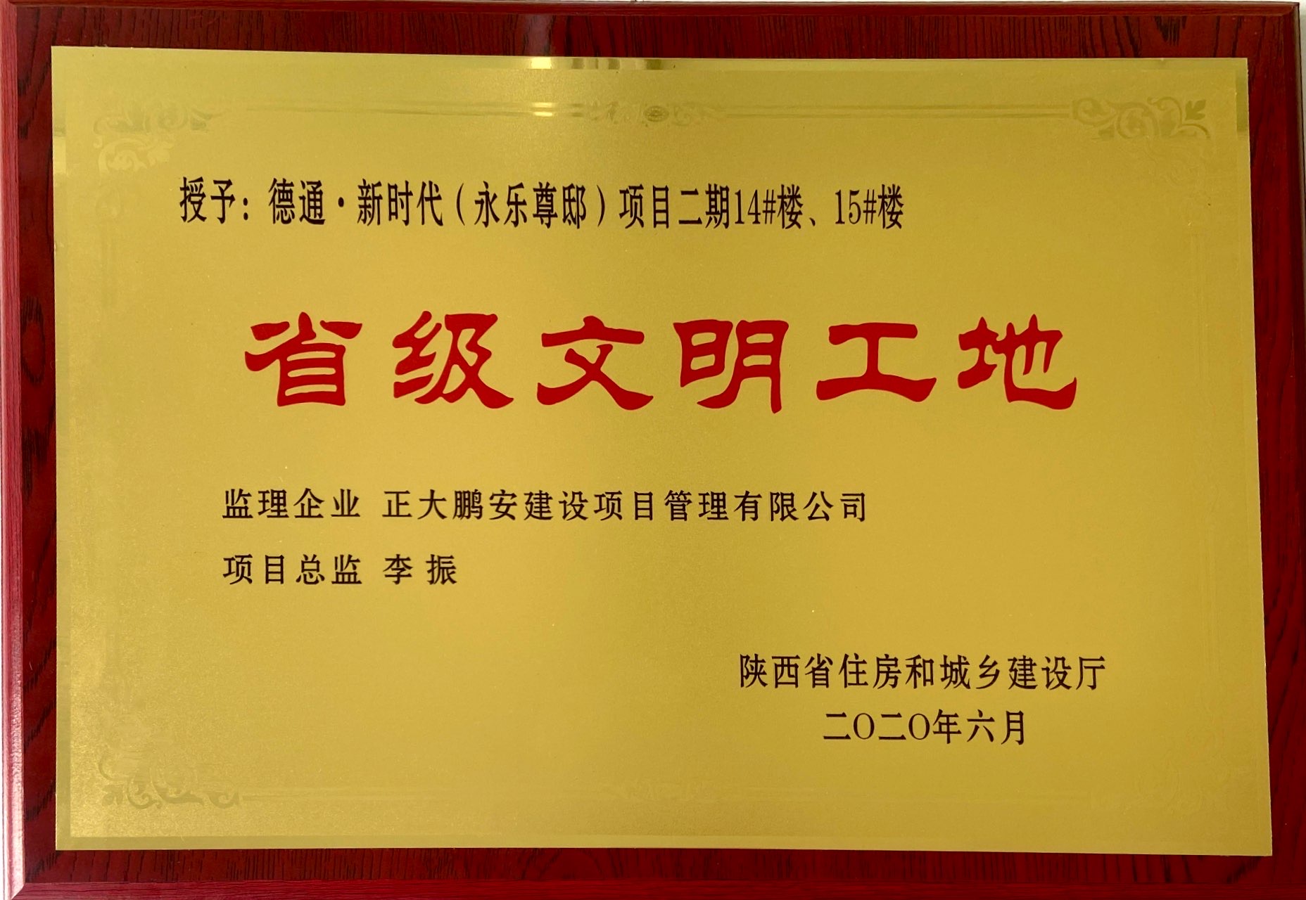 近日,經(jīng)陜西省住房和城鄉(xiāng)建設(shè)廳評定,由正大鵬安公司監(jiān)理的德通·新時代(永樂尊邸)項目二期14#樓、15#樓榮獲“省級文明工地”。