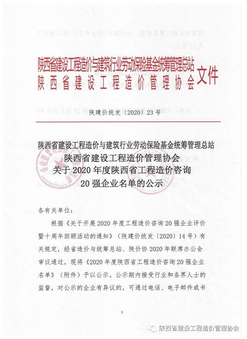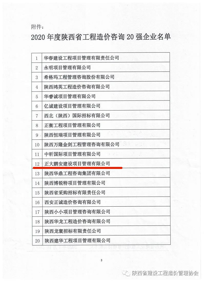 正大鵬安公司被評為“2020年度陜西省工程造價(jià)咨詢20強(qiáng)企業(yè)”
