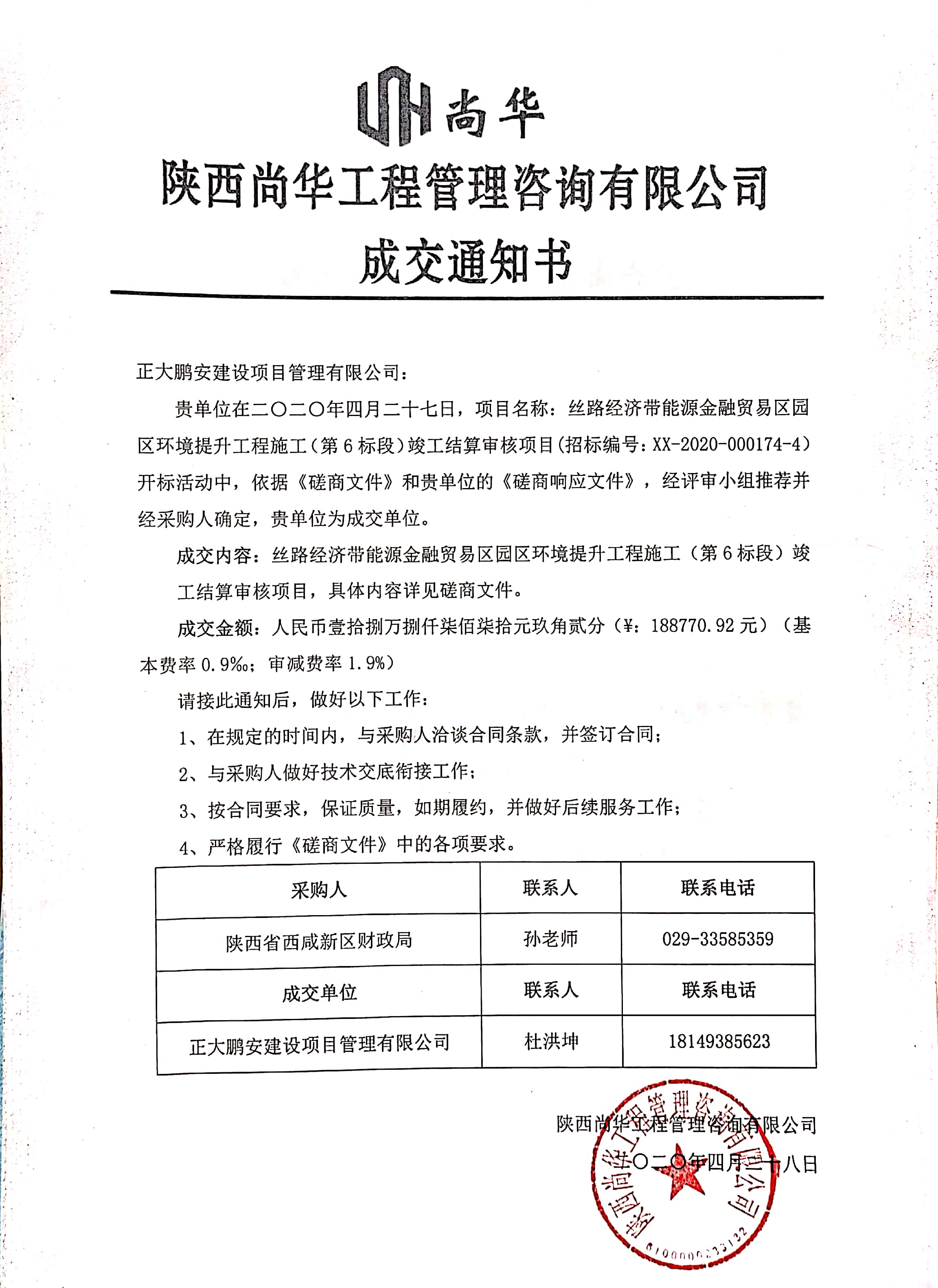 近日,陜西省西咸新區(qū)開發(fā)建設(shè)管理委員會對“絲路經(jīng)濟(jì)帶能源金融貿(mào)易區(qū)園區(qū)環(huán)境提升工程施工(第六標(biāo)段)竣工結(jié)算審核項目”進(jìn)行公開招標(biāo),經(jīng)評標(biāo)委員會綜合評審,招標(biāo)人確認(rèn),正大鵬安建設(shè)項目管理有限公司為中標(biāo)人。