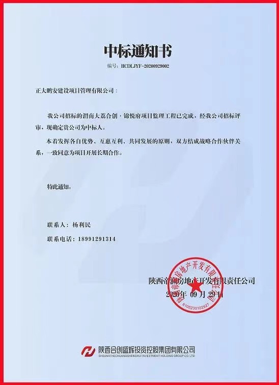 2020年9月,經(jīng)評(píng)標(biāo)委員會(huì)評(píng)定,招標(biāo)人確認(rèn),正大鵬安建設(shè)項(xiàng)目管理有限公司中標(biāo)陜西帝瀾房地產(chǎn)開(kāi)發(fā)有限責(zé)任公司的“渭南大荔合創(chuàng)•錦悅府監(jiān)理”項(xiàng)目。