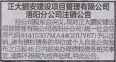 經(jīng)公司股東會(huì)決議,對(duì)正大鵬安建設(shè)項(xiàng)目管理有限公司河南洛陽(yáng)分公司(注冊(cè)號(hào)91410307MA44GUUY67)予以注銷(xiāo),請(qǐng)有債權(quán)債務(wù)的單位和個(gè)人自登報(bào)之日起45日內(nèi)前來(lái)辦理相關(guān)事宜,逾期不報(bào)視為放棄處理,特此公告。