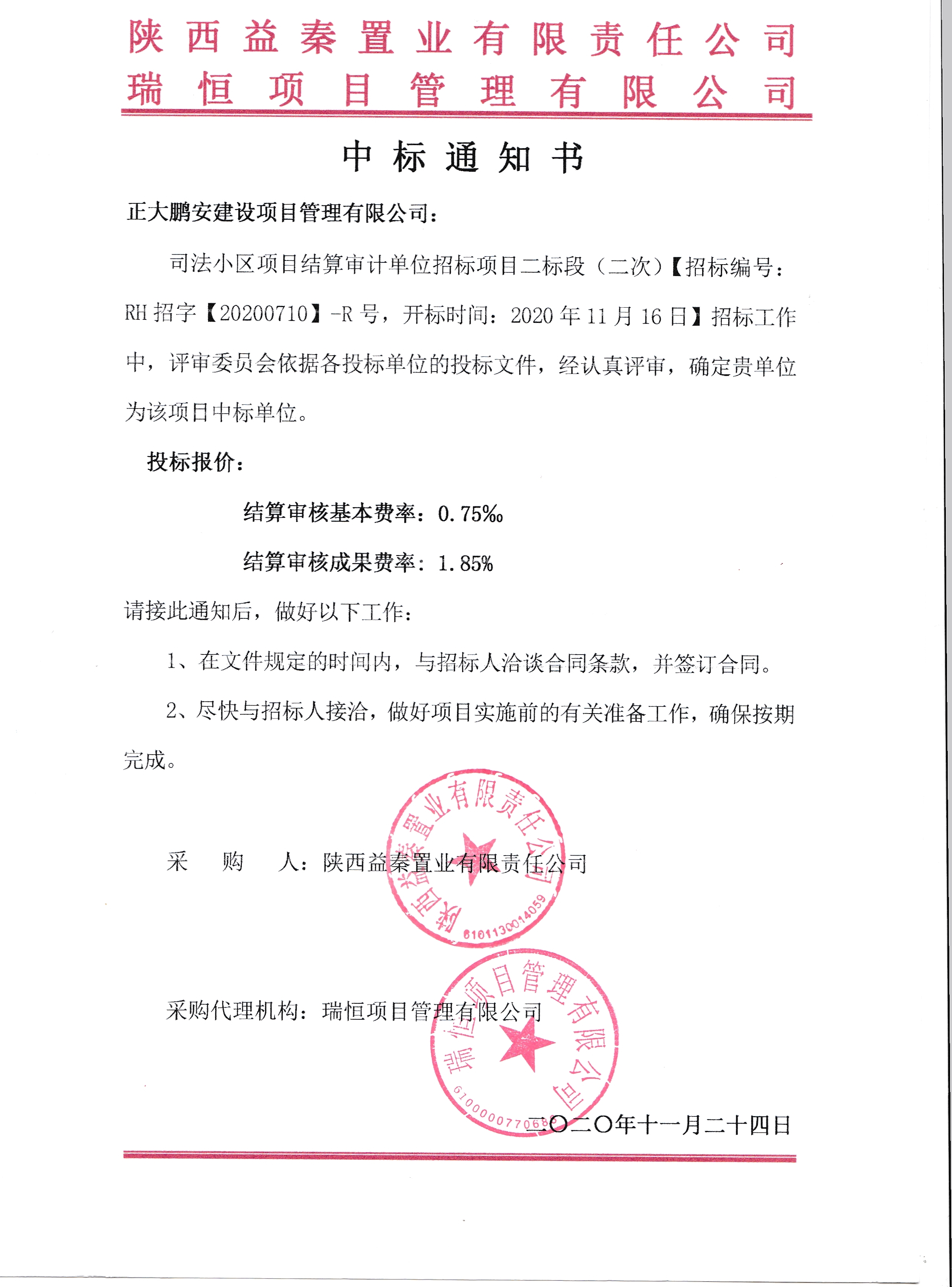 近日,我公司參與"司法小區(qū)項目結(jié)算審計單位招標(biāo)項目二標(biāo)段"項目,經(jīng)評審委員會綜合評審,招標(biāo)人確認(rèn),正大鵬安建設(shè)項目管理有限公司中標(biāo)。