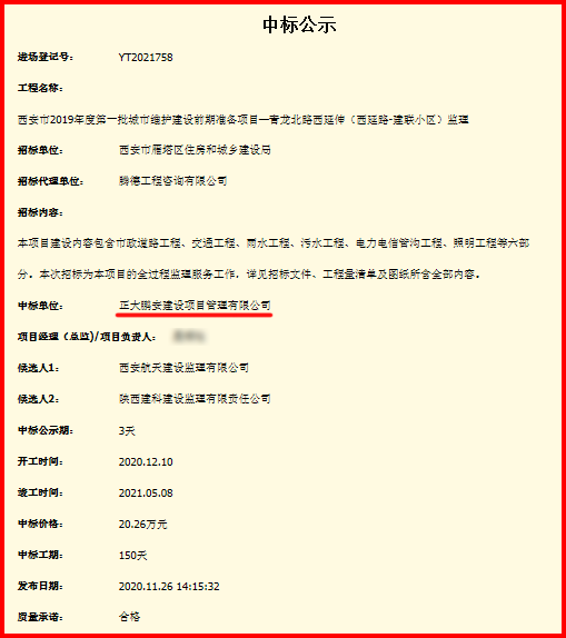 2020年11月24日,西安市雁塔區(qū)住房和城鄉(xiāng)建設(shè)局委托第三方就“西安市2019年度第一批城市維護(hù)建設(shè)前期準(zhǔn)備項(xiàng)目-青龍北路西延伸(西延路-建聯(lián)小區(qū))監(jiān)理”項(xiàng)目進(jìn)行公開招標(biāo),經(jīng)評(píng)審委員會(huì)綜合評(píng)審,招標(biāo)人確認(rèn),正大鵬安建設(shè)項(xiàng)目管理有限公司中標(biāo)。