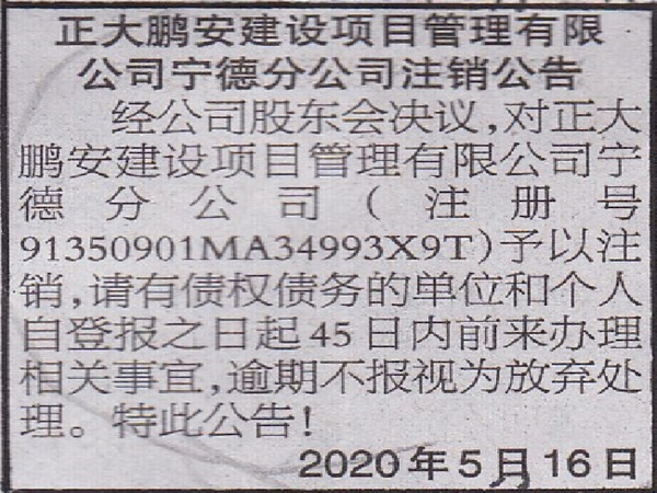 經(jīng)公司股東會決議,對正大鵬安建設(shè)項目管理有限公司寧德分公司(注冊號91350901MA34993X9T)予以注銷,請有債權(quán)債務(wù)的單位和個人自登報之日起45日內(nèi)前來辦理相關(guān)事宜,逾期不報視為放棄處理,特此公告。