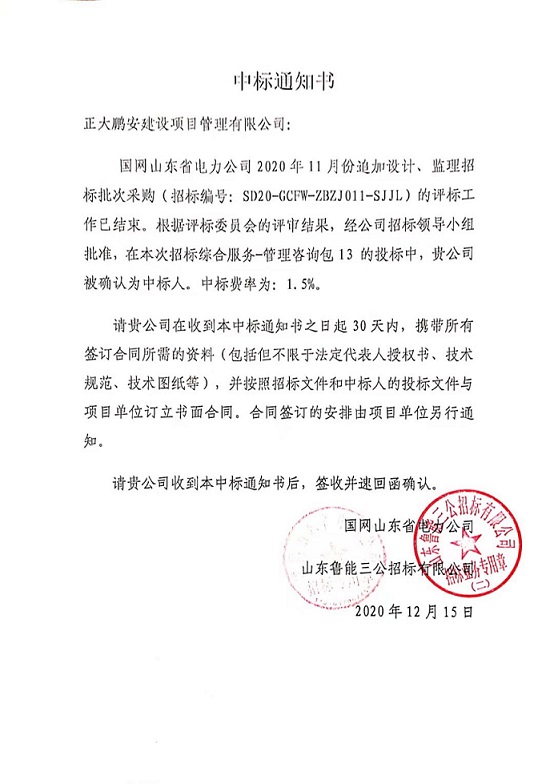 正大鵬安中標(biāo)國(guó)網(wǎng)山東省電力公司2020年11月份追加設(shè)計(jì)、監(jiān)理招標(biāo)批次采購(gòu)項(xiàng)目