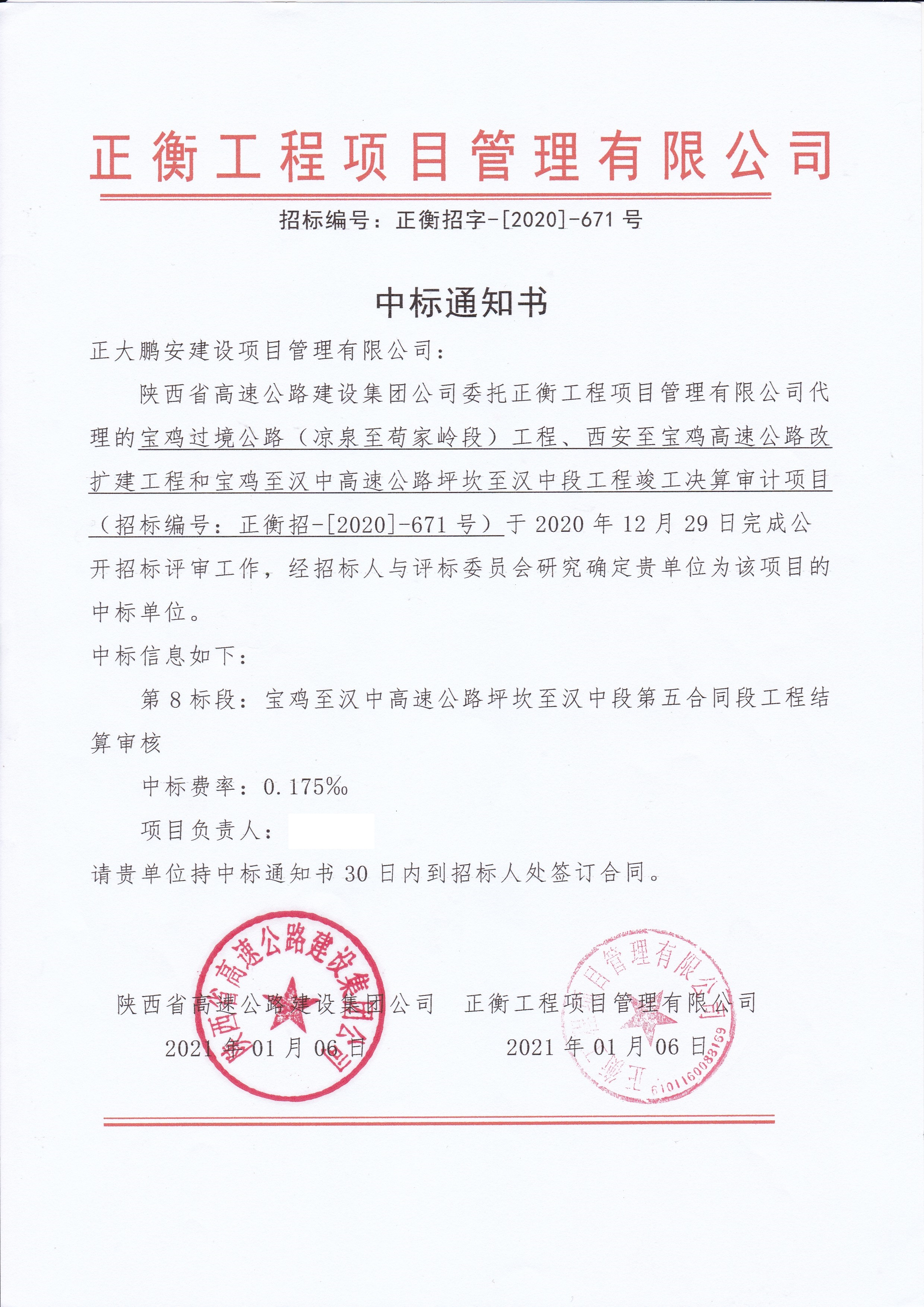 近日,我公司參與“寶雞過境公路(涼泉至茍家?guī)X段)工程、西安至寶雞高速公路改擴(kuò)建工程和寶雞至漢中高速公路坪坎至漢中段工程竣工決算審計項(xiàng)目”投標(biāo),經(jīng)評標(biāo)小組評審,招標(biāo)人陜西省高速公路建設(shè)集團(tuán)公司確認(rèn),正大鵬安公司中標(biāo)該項(xiàng)目第8標(biāo)段。