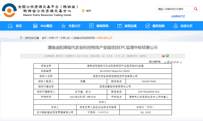 2021年4月6日,正大鵬安建設(shè)項(xiàng)目管理有限公司參與了“渭南鹵陽(yáng)湖現(xiàn)代農(nóng)業(yè)科技物流產(chǎn)業(yè)園項(xiàng)目EPC監(jiān)理”投標(biāo),經(jīng)評(píng)標(biāo)小組評(píng)審,招標(biāo)人陜西內(nèi)府生態(tài)航空城投資開發(fā)有限公司確認(rèn),正大鵬安建設(shè)項(xiàng)目管理有限公司中標(biāo)。