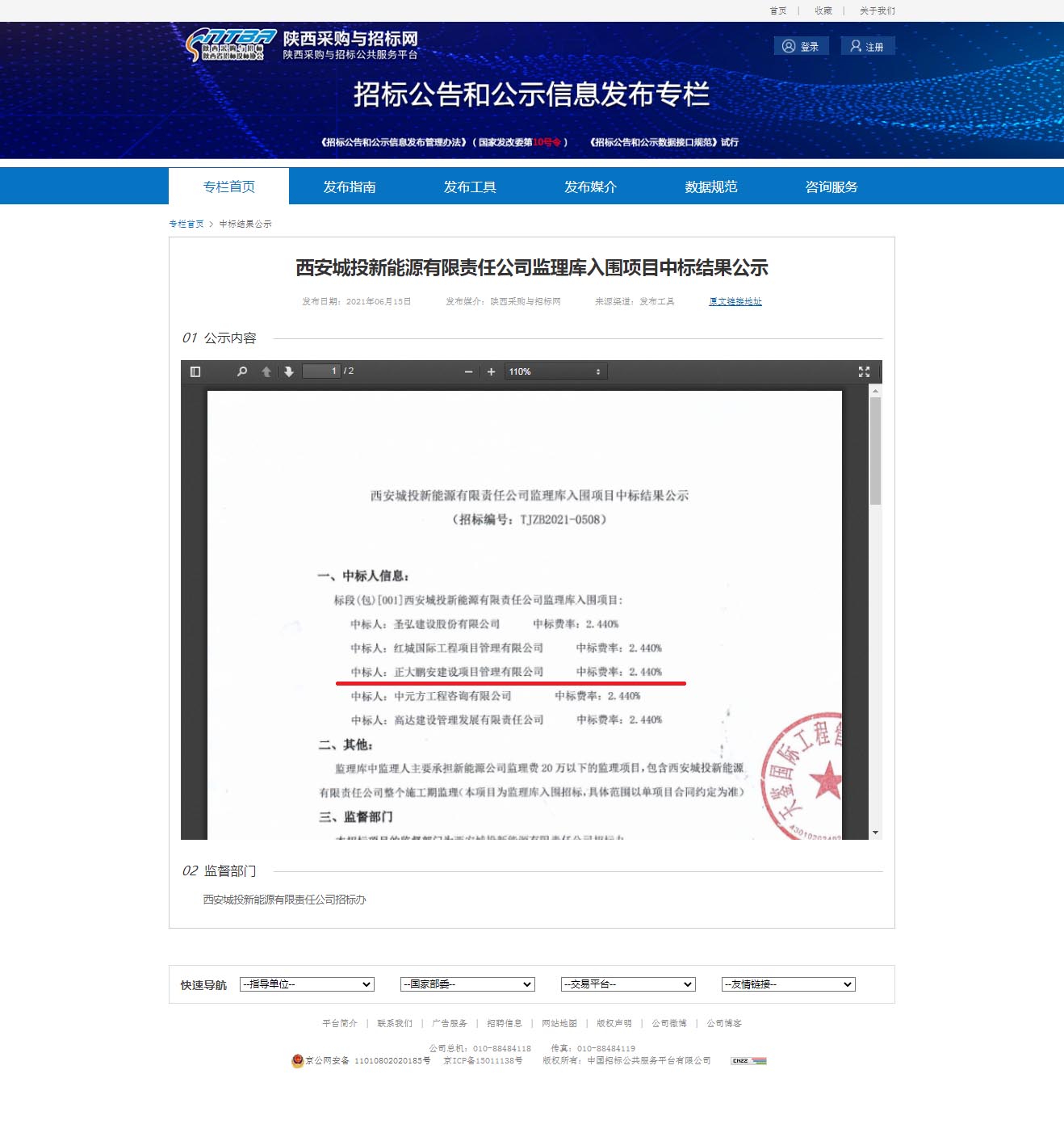 2021年6月10日,正大鵬安建設(shè)項(xiàng)目管理有限公司參與了“西安城投新能源有限責(zé)任公司監(jiān)理庫入圍項(xiàng)目”投標(biāo),經(jīng)評標(biāo)小組評審,招標(biāo)人西安城投新能源有限責(zé)任公司確認(rèn),正大鵬安建設(shè)項(xiàng)目管理有限公司中標(biāo)。