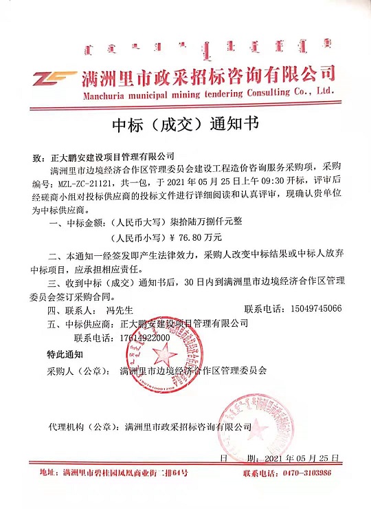 我公司參與滿洲里市邊境經(jīng)濟(jì)合作區(qū)管理委員會(huì)建設(shè)工程造價(jià)咨詢服務(wù)采購(gòu)項(xiàng)目公開(kāi)招標(biāo),經(jīng)依法招標(biāo),評(píng)審委員會(huì)綜合評(píng)審,招標(biāo)人確認(rèn),確認(rèn)正大鵬安建設(shè)項(xiàng)目管理有限公司中標(biāo)。