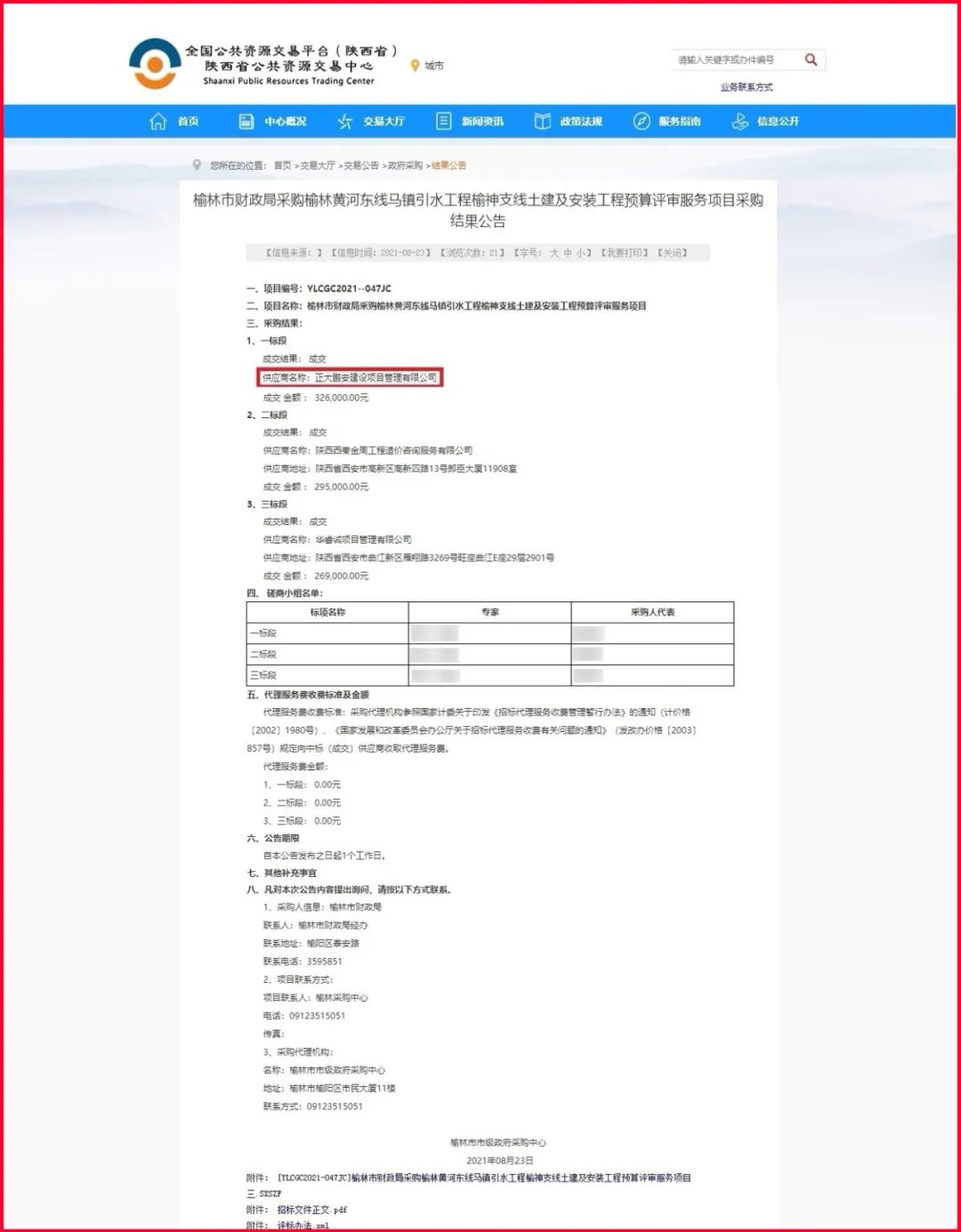 正大鵬安中標(biāo)榆林市財(cái)政局采購(gòu)榆林黃河?xùn)|線馬鎮(zhèn)引水工程榆神支線土建及安裝工程預(yù)算評(píng)審服務(wù)項(xiàng)目一標(biāo)段
