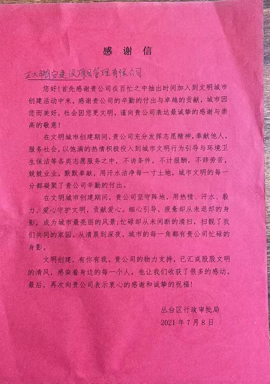 在邯鄲市開展的文明城市創(chuàng)建期間,正大鵬安公司表現(xiàn)優(yōu)益,貢獻(xiàn)卓越,受到叢臺(tái)區(qū)行政審批局的表?yè)P(yáng)。