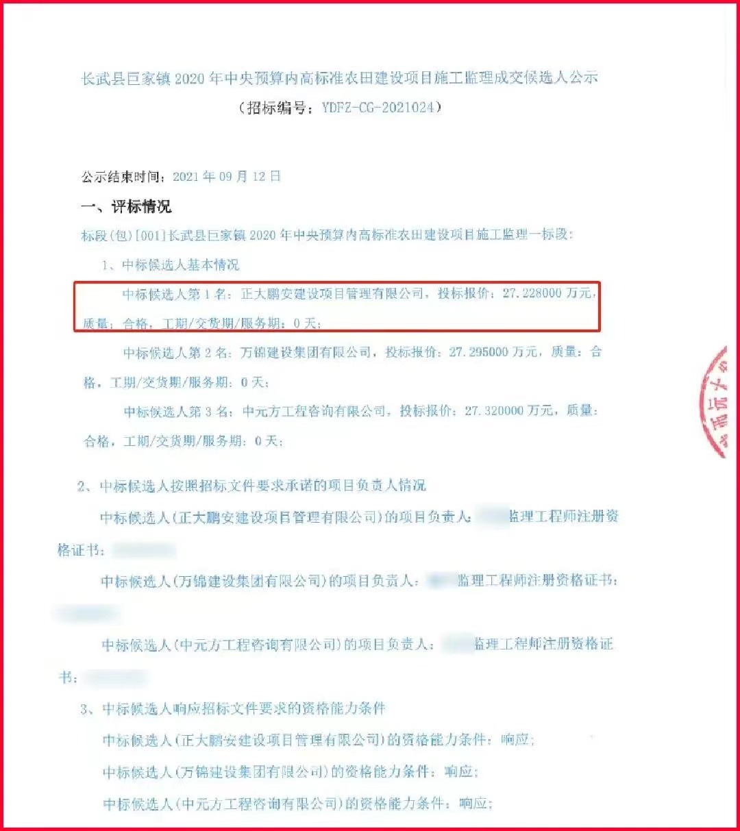 2021年9月,經(jīng)評(píng)標(biāo)委員會(huì)評(píng)定,招標(biāo)人確認(rèn),正大鵬安建設(shè)項(xiàng)目管理有限公司中標(biāo)長(zhǎng)武縣農(nóng)業(yè)農(nóng)村局的“長(zhǎng)武縣巨家鎮(zhèn)2020年中央預(yù)算內(nèi)高標(biāo)準(zhǔn)農(nóng)田建設(shè)項(xiàng)目施工監(jiān)理一標(biāo)段”項(xiàng)目。