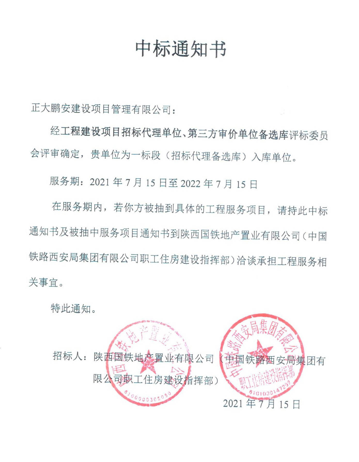 正大鵬安中標(biāo)陜西國(guó)鐵地產(chǎn)置業(yè)有限公司工程建設(shè)項(xiàng)目招標(biāo)代理單位、第三方審價(jià)單位備選庫(kù)項(xiàng)目