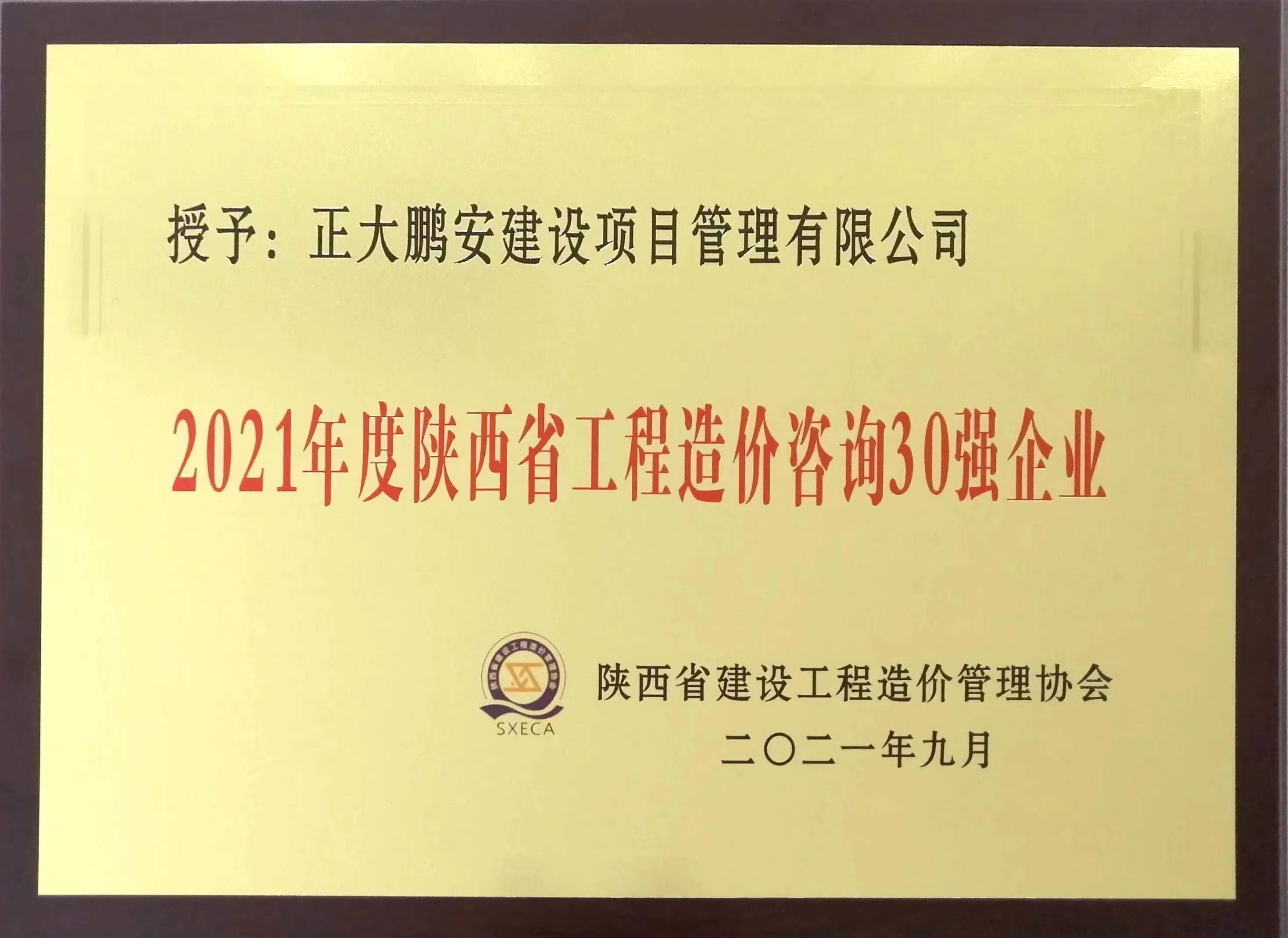 正大鵬安建設(shè)項(xiàng)目管理有限公司榮獲“2021年度陜西省工程造價咨詢30強(qiáng)企業(yè)”