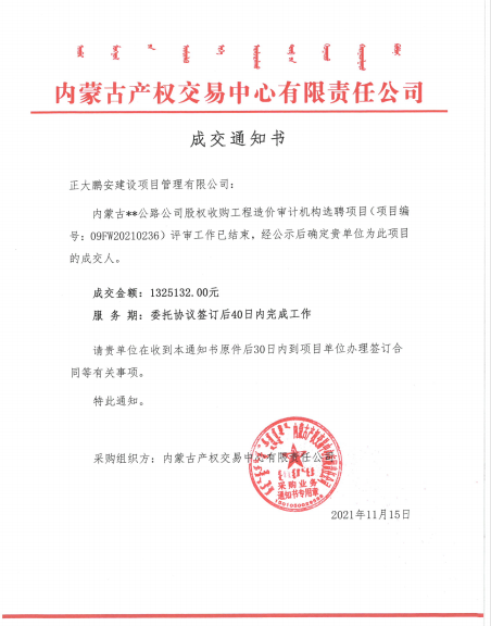 中標(biāo)內(nèi)蒙古--公路公司股權(quán)收購工程造價(jià)審計(jì)機(jī)構(gòu)選聘項(xiàng)目