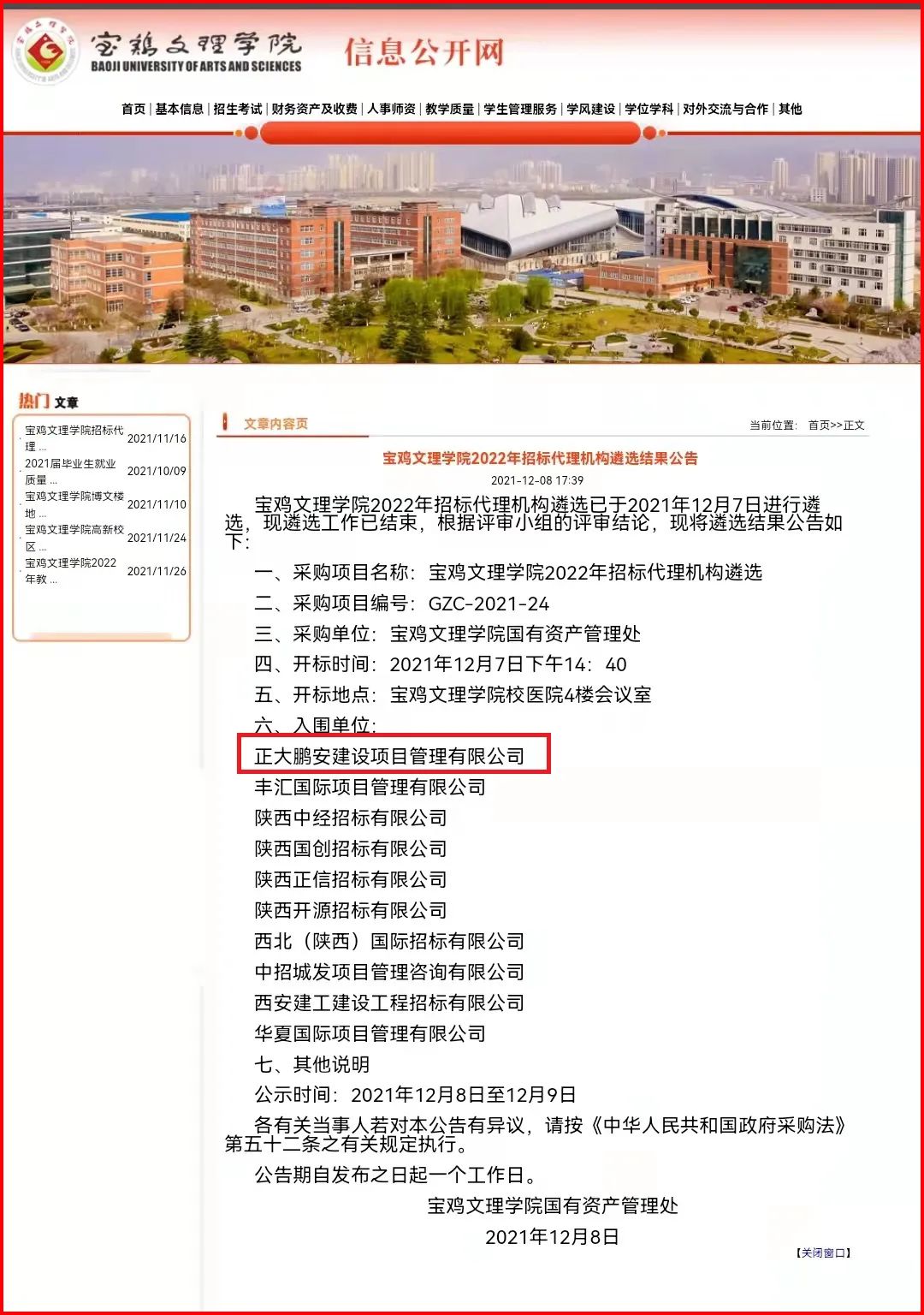 正大鵬安入圍寶雞文理學院2022年招標代理機構遴選項目
