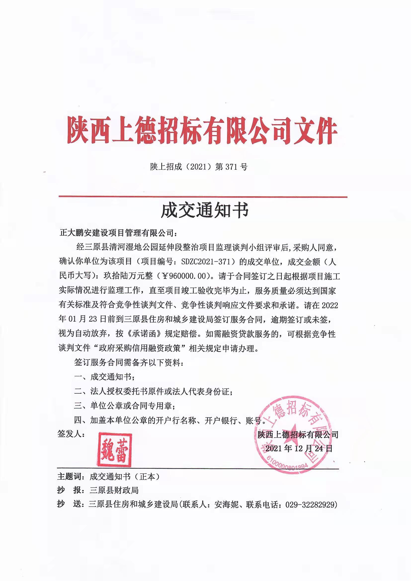 2021年12月,經(jīng)評(píng)標(biāo)委員會(huì)評(píng)定,招標(biāo)人確認(rèn),正大鵬安建設(shè)項(xiàng)目管理有限公司中標(biāo)"三原縣清河濕地公園延伸整治項(xiàng)目"